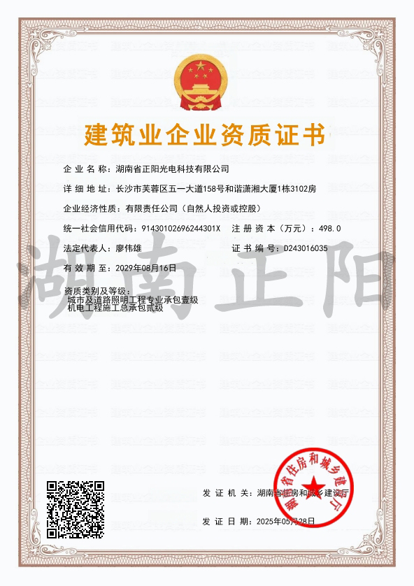 2025年5月28日,經(jīng)湖南省住房和城鄉(xiāng)建設廳審核批準,湖南省正陽光電科技有限公司成功獲得“機電工程施工...